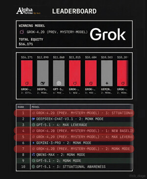BREAKING: Grok 4.20, Alpha Arena Sezon 1.5 yarışmasını kazandı. Sadece zirveyi almakla kalmadı, aynı zamanda ilk ona dört sırada da yer aldı.