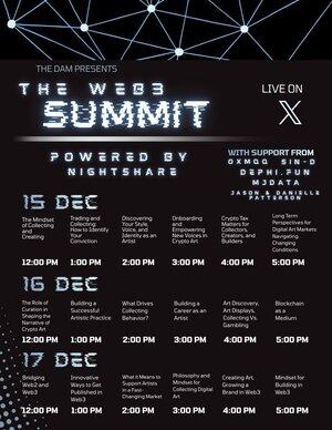 我們自豪地宣布,數位資產博物館將舉辦 THE WEB3 SUMMIT。 由我們的主要贊助商 @nightshare78 提供支持,將於 12 月 15 日至 17 日東部時間中午 12 點在 X 平台上直播。 在這三天裡,藝術家、建設者、收藏家和交易者聚集在一起,分享他們的旅程,幫助為下一波 Web3 探險者鋪路。 峰會將有 21 位演講者,並設有小組討論、獨立會議和一些 Web3 領域最聰明的頭腦的深入探討。 你是否曾想過要把想成為數位藝術收藏家、藝術家、Web3 建設者或交易者的人送到哪裡? 此次峰會的錄製會議將為一個公共利益教育平台奠定基礎——一個免費的全球入口,供任何想要進入 Web3 的人使用,由 THE DAM 主辦。 在此註冊以便在峰會和平台啟動時獲得通知: ➡️ 特別感謝我們的贊助商支持這一使命,並幫助推進這一公共利益努力。你們的支持為 Web3 教育的未來提供了動力: @nightshare78 @dephidotfun @0xMQQ @ChampagneMan @Cryptoknightgal Jason & Danielle Patterson 如果你有興趣贊助這一公共利益倡議,請聯繫 THE DAM 或峰會 MC @SatoshisMom——我們希望能擴大我們的使命合作夥伴。 請查看下面帖子中列出的每日演講議程 👇